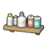 A decorative shelf lined with ceramic bottles. Attach it to a wall to liven up any space!